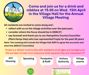 - The next meeting of Froyle Parish Council will be held on Monday 11th May 2026 @ 19.00 in Froyle Village Hall – all members of the public are welcome to attend. Items that residents want to have included on the agenda should be notified to the Clerk by Wednesday 6th May. This meeting will also be the AGM